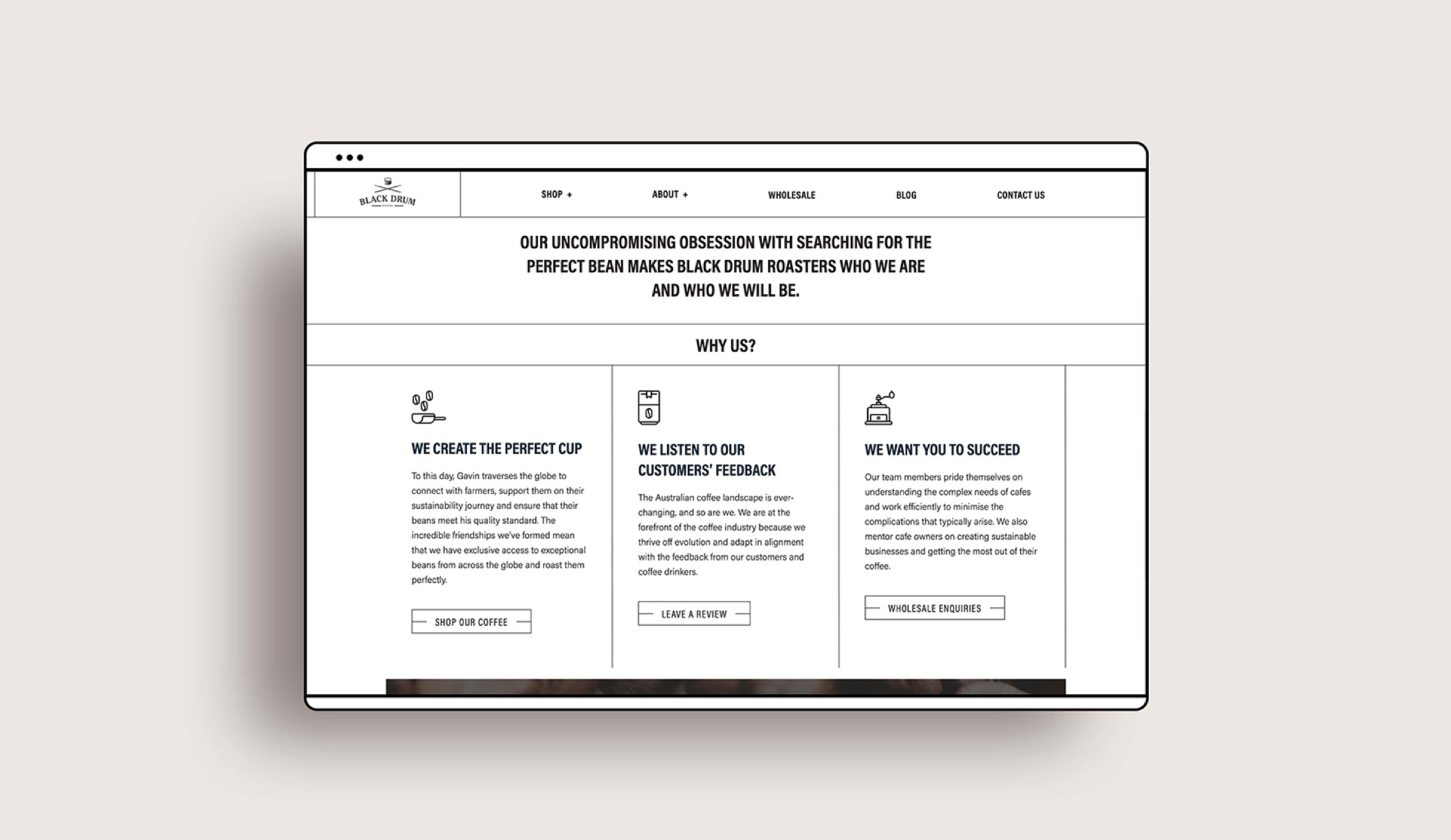 By using clean lines, sharp imagery and a minimalistic black and white design, our web design team were able to create a beautifully curated website which perfectly communicates everything Black Drum Roasters stands for.