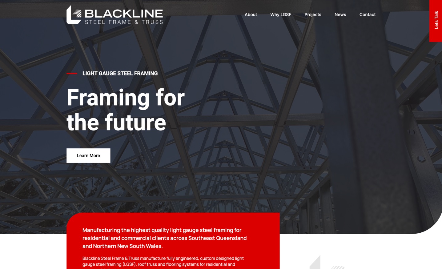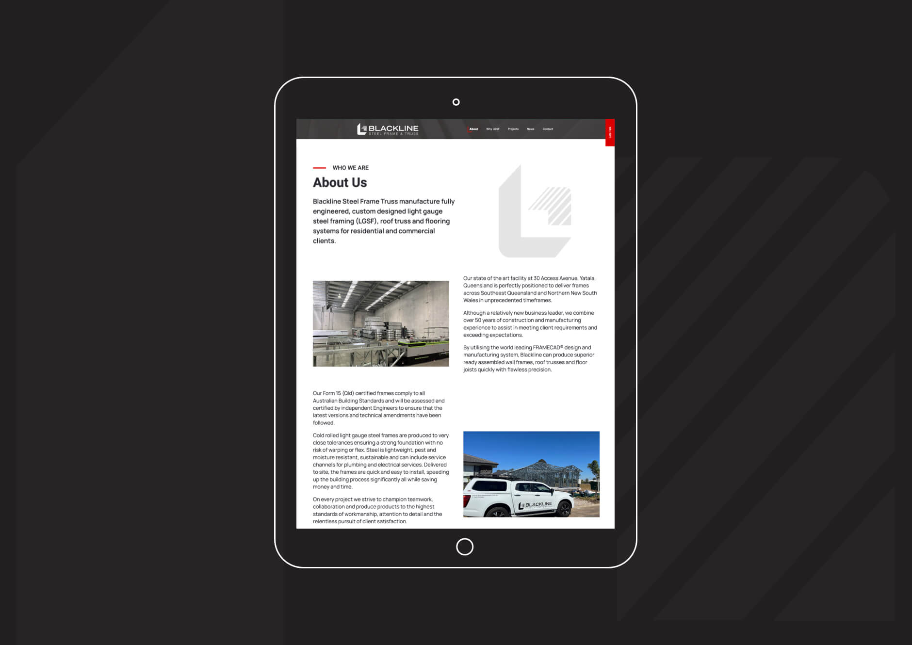 Blackline Steel Frame and Truss approached Thrive to design a logo, branding and a website. We chose a strong logo and branding design to complement their services, and a website design that captures their knowledge and experience in the industry.