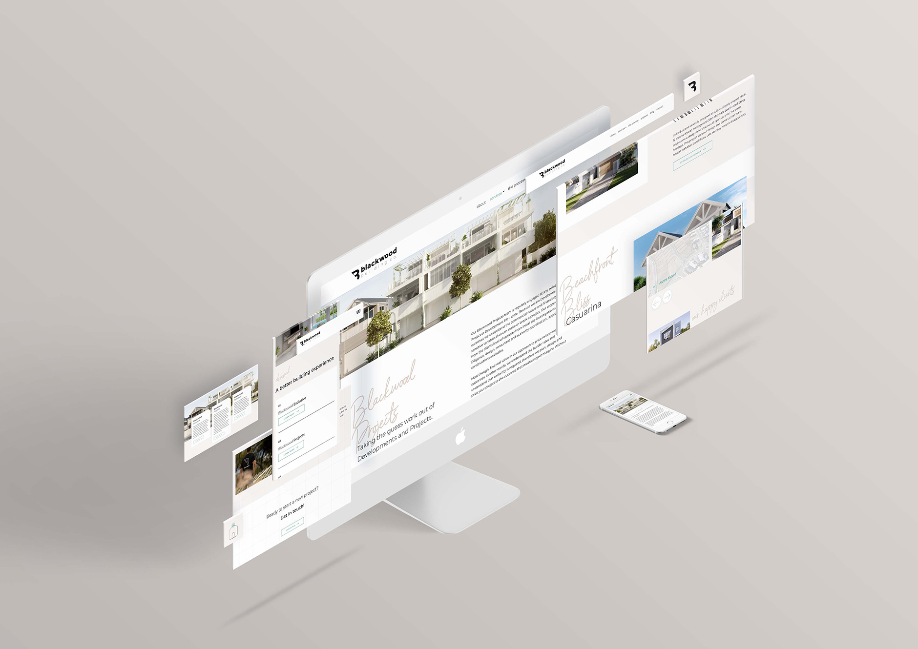 With innovation, individuality and integrity at the forefront of Blackwood Building Co’s vision, we created a branding guide that blended seamlessly with their business’ identity. Known for their innovation and exceptional designs, we opted for a modern coastal feel using subdued beige tones and whites. Much like their designs and builds, we wanted to create an elegant and contemporary feel through modern text and a clean colour palette that stays effortlessly timeless.