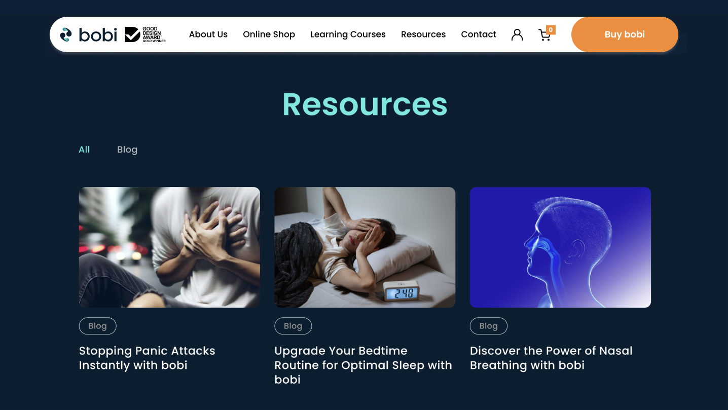 The focus of this website is to shine a spotlight on the advantages of bobi, and our designers achieved this through engagement and education. The homepage features a captivating full-screen looping video showing bobi in action. A user-friendly interface offers clear, step-by-step instructions on how users can reap the benefits of bobi, through the primary principles of seeing, feeling, and guiding.