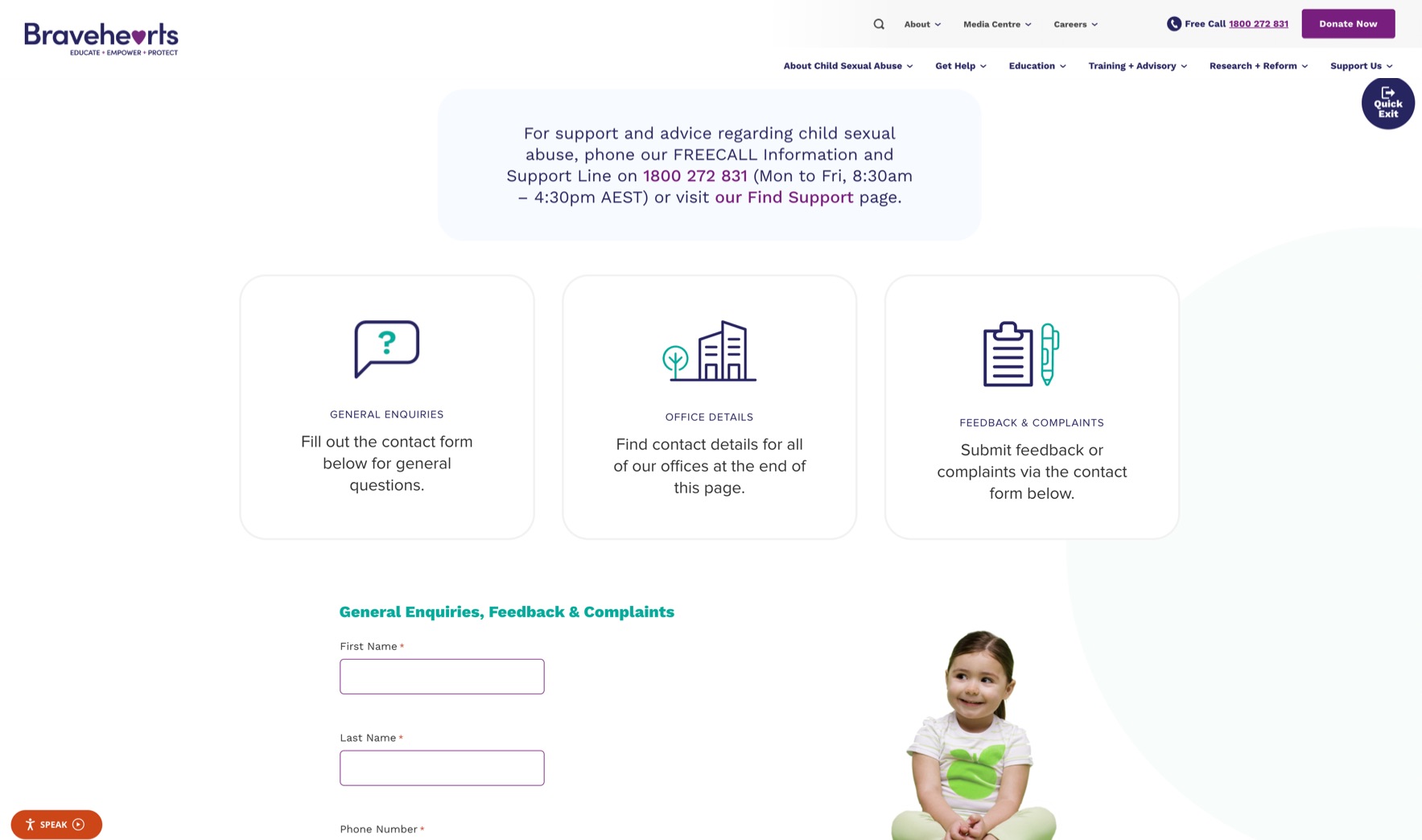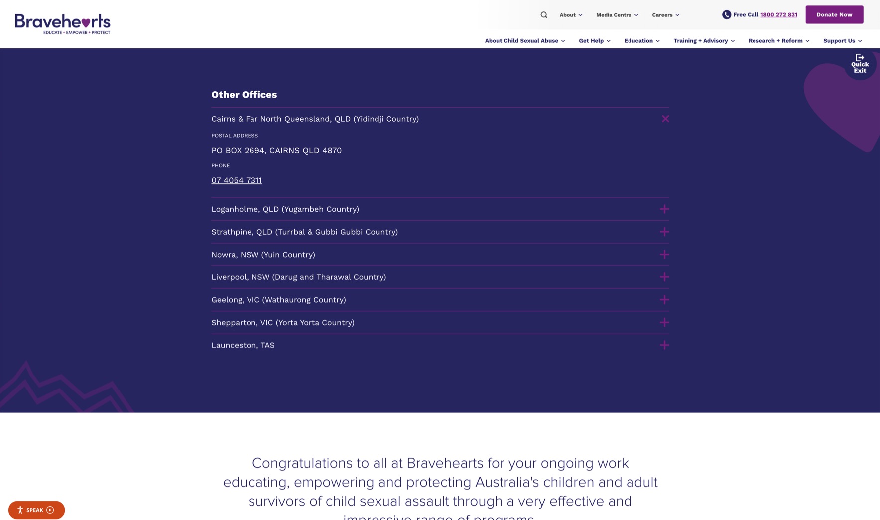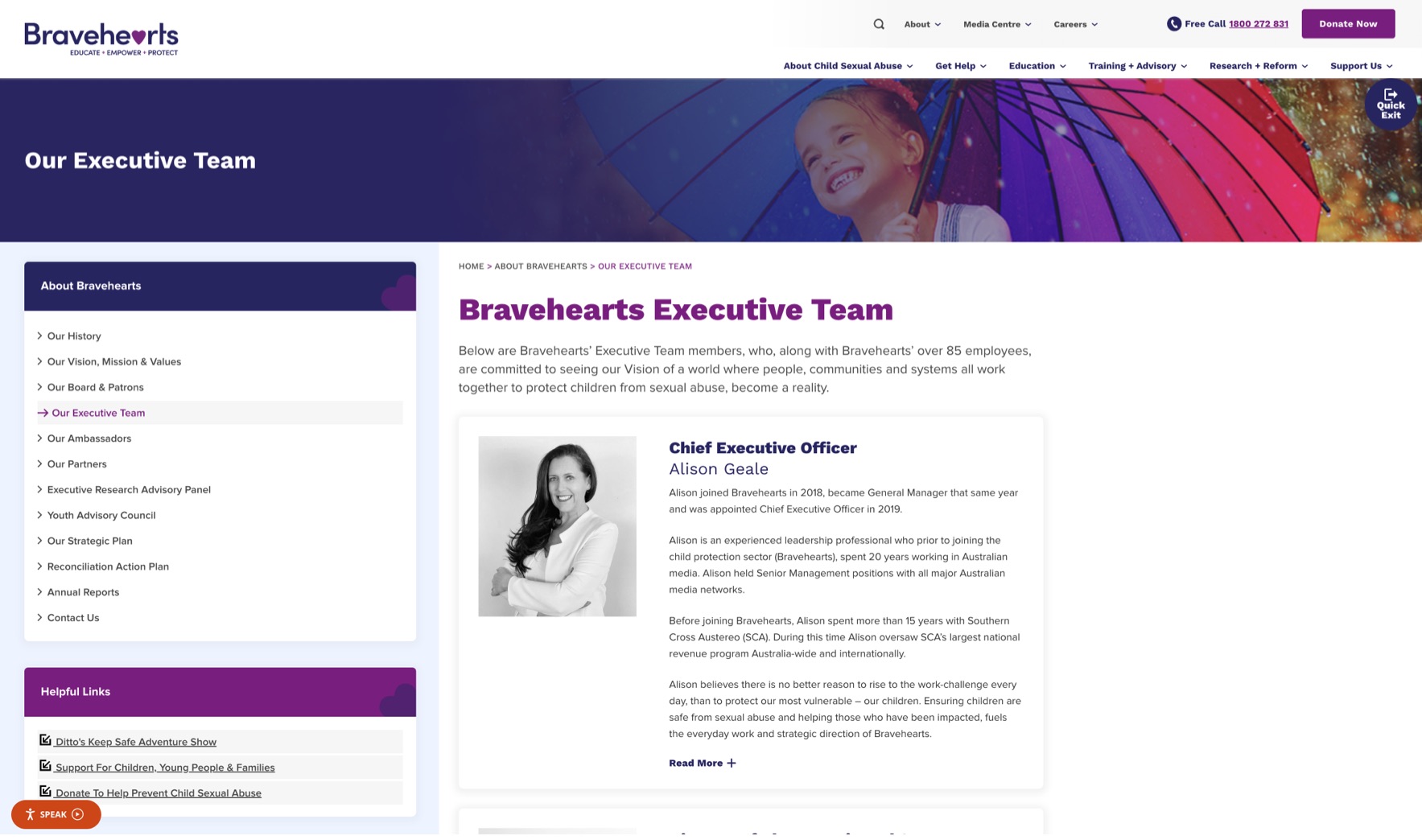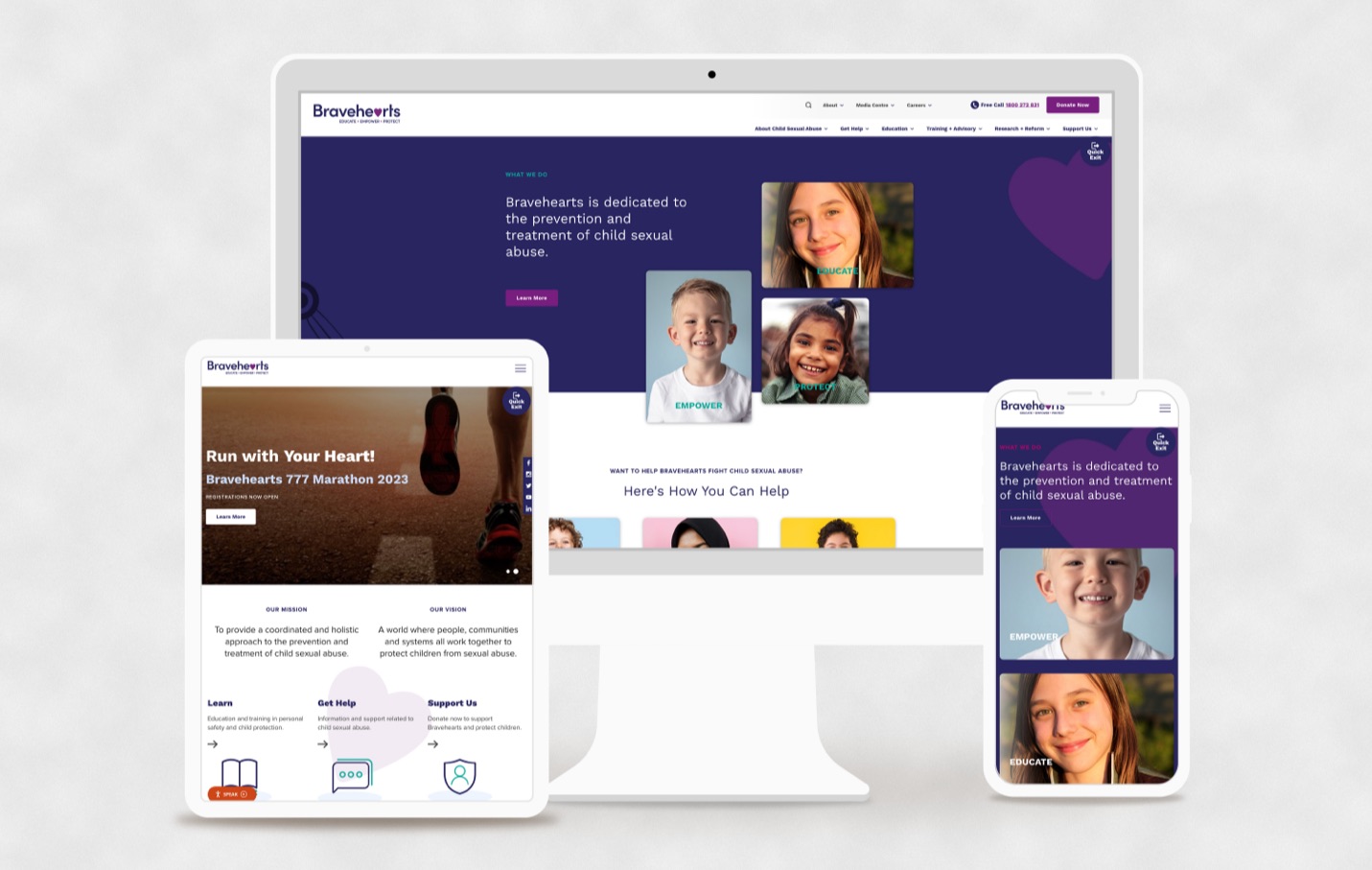 Bravehearts primary goal is to prevent child abuse. Thrive has been proud to work with this important, not-for-profit charity for many years when we did a revamp of their website in 2016. It was time for another upgrade to bring the brand and the website into 2022. With hundreds of pages on the Bravehearts’ site to redesign and restructure, we built a robust, dynamic framework with the ability to create an array of layouts and page sections for the huge amount of important information.