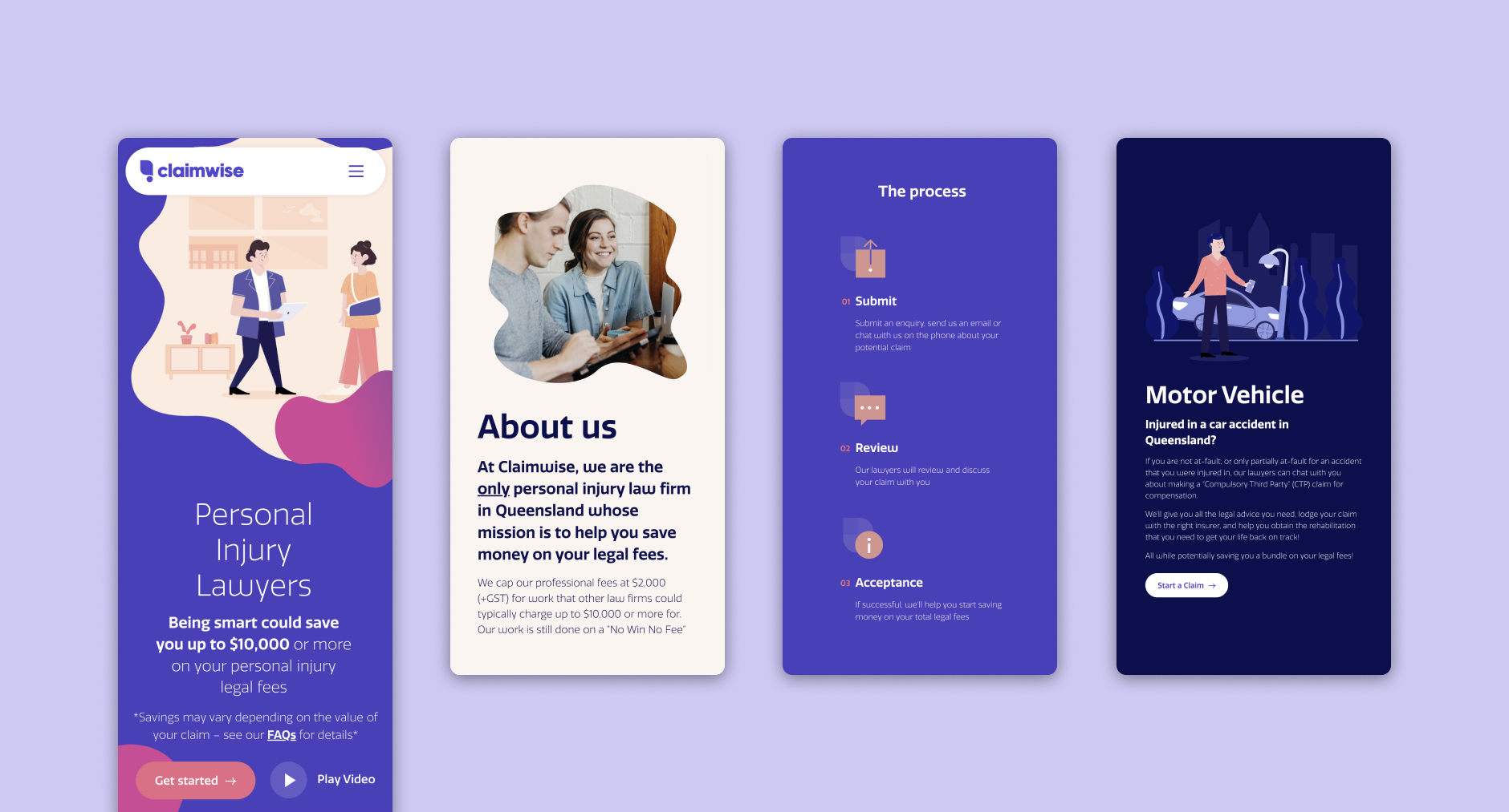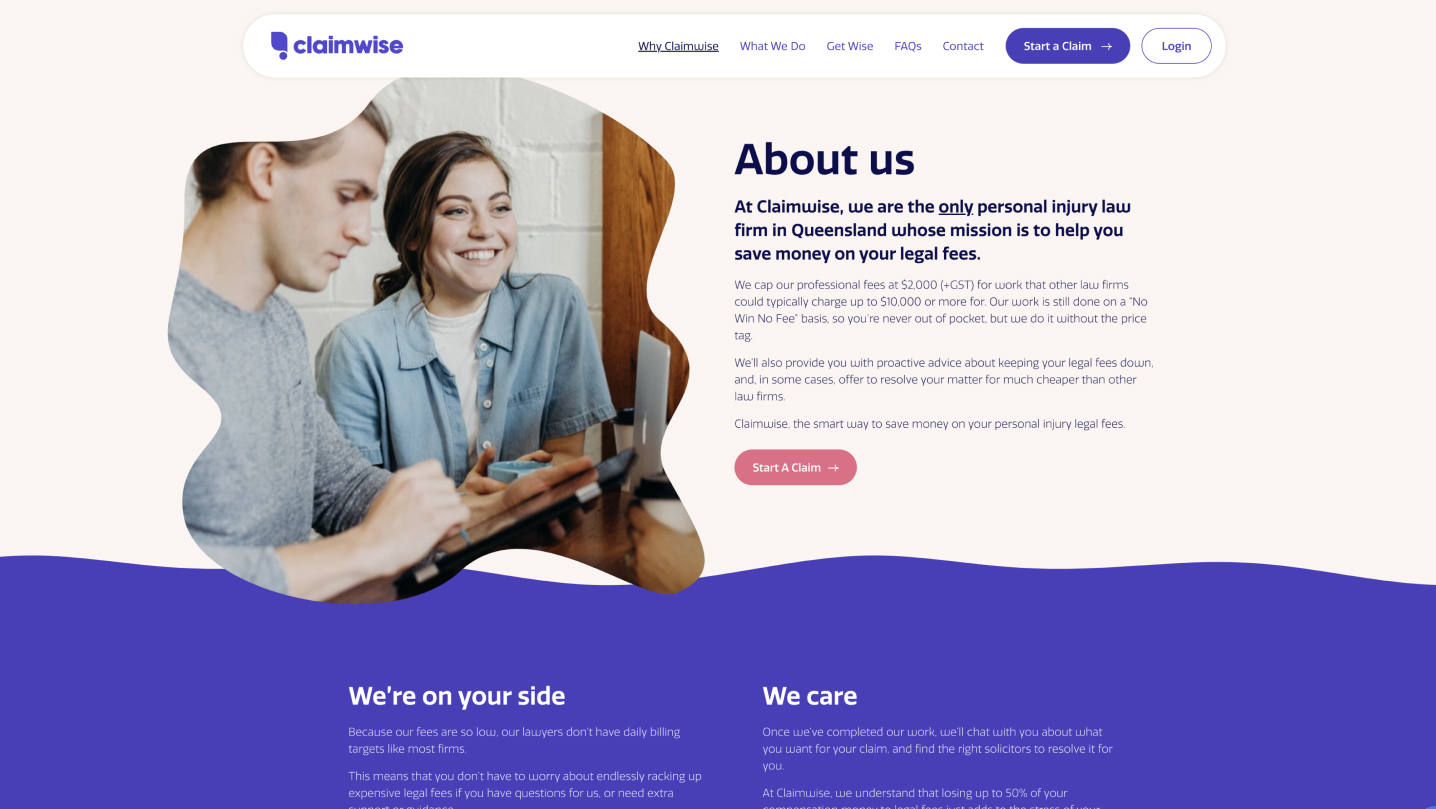 The homepage features a video and a ‘get started’ button to help users step through their journey to access Claim Wise services. With a ‘Get Wise’ blog page and lengthy FAQs, we have ensured website visitors can access the information and resources they need. This isn’t your ordinary personal injury lawyer website.