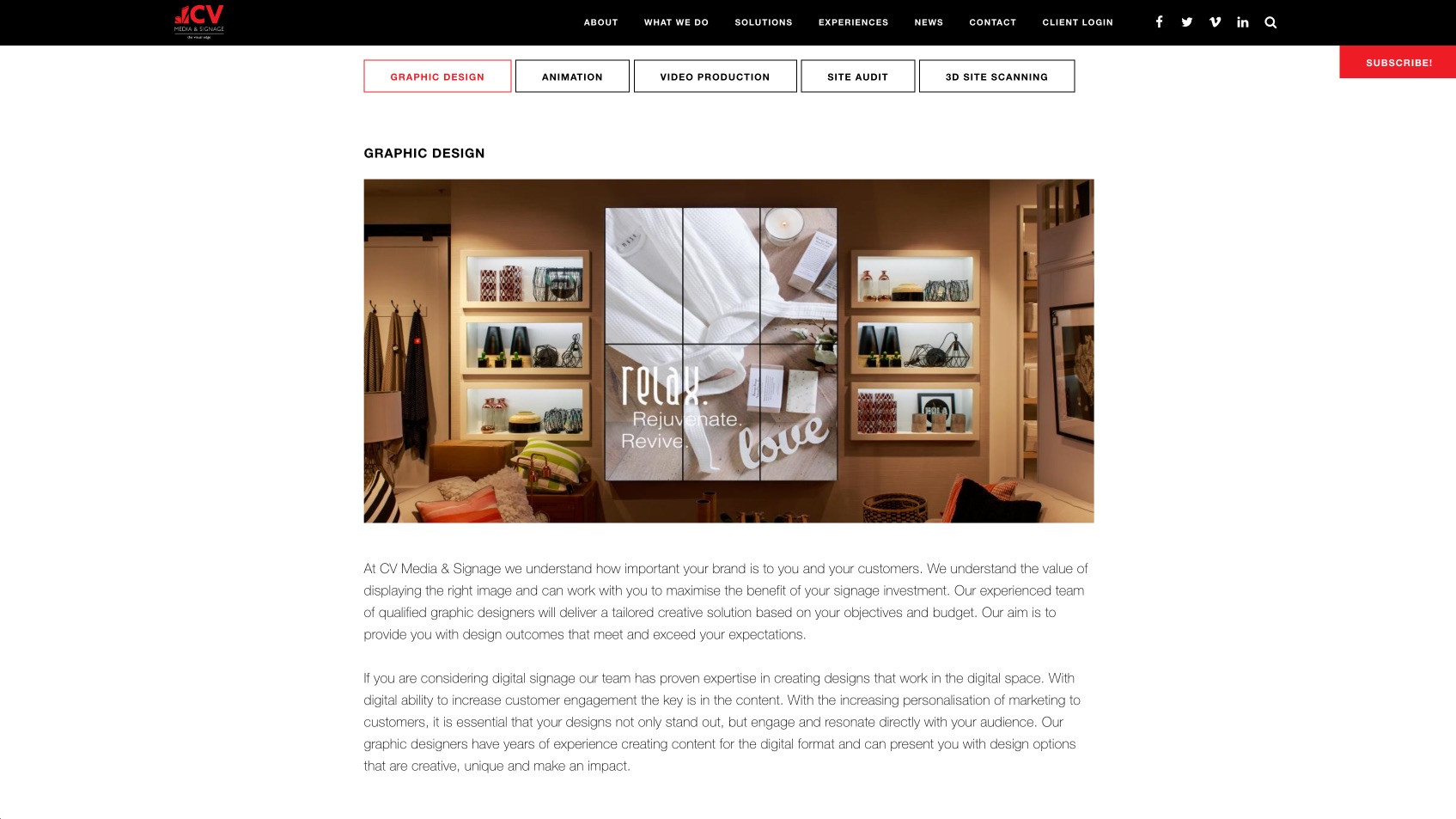 CV Media & Signage are a national provider of customised visual solutions. They have been providing businesses with digital or static signage for over 30 years. Thrive Digital was tasked with designing their website that needed to maintain an energetic, dynamic aesthetic tone throughout the site. While being clean, modern and straightforward in functionality, we still needed to add a touch of personality to make the site stand out from the competition.