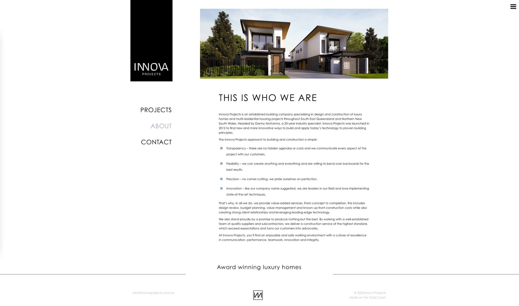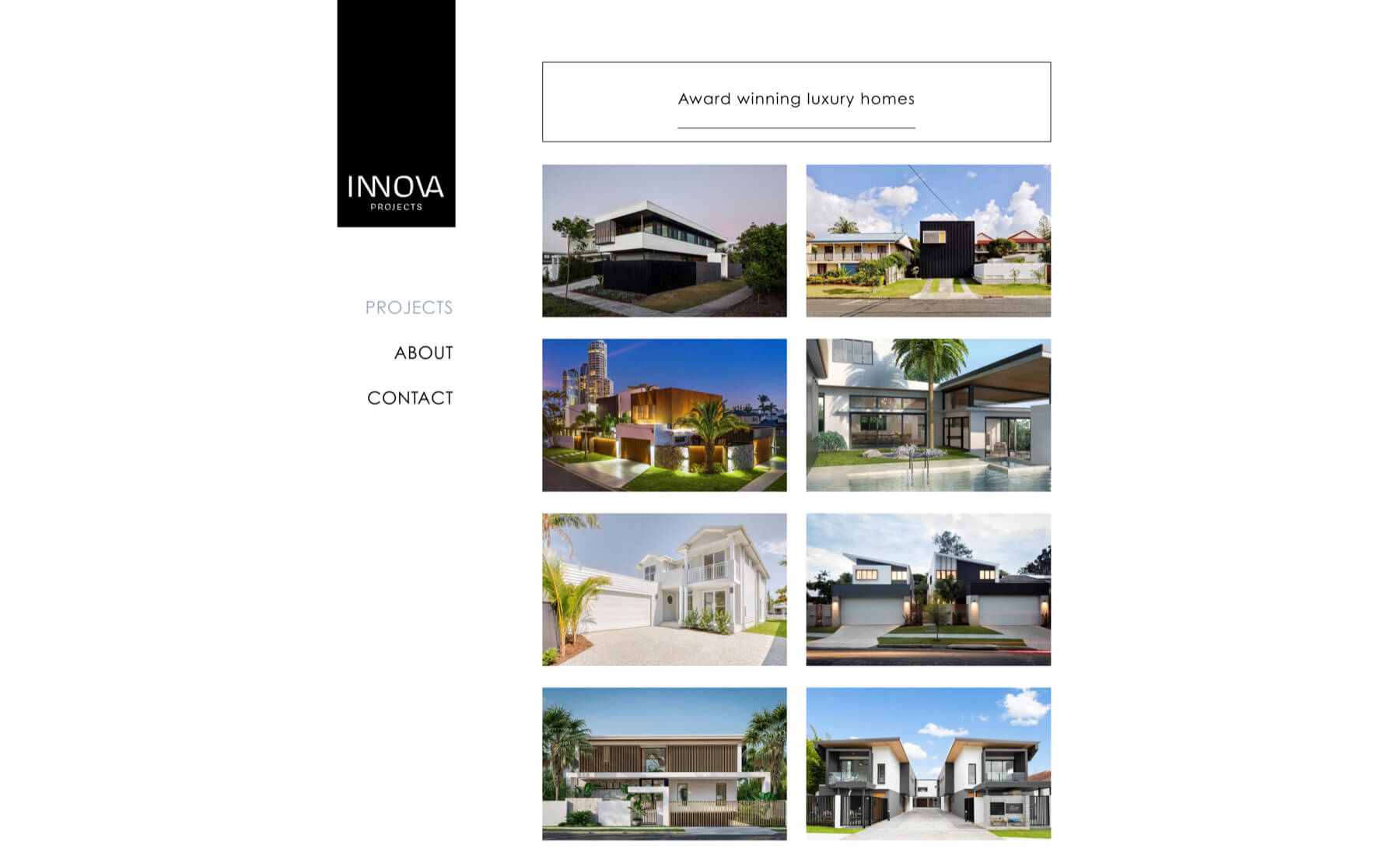 Developers and builders of mid-to-high-end homes, Innova was looking to project an image as a leading authority in architecture. Wanting to be seen as a prestigious firm, but without frightening off potential customers. We went for a crisp, professional-looking site that maintains an aesthetic tone throughout. We wanted to impress users - who are all potential clients - with its slick interfaces and savvy navigation. We thought the project section should speak for itself and shouldn't require too many extra frills to distract from the main objective. We built it specifically with expansion in mind so it's easy for the Innova team to add work in the future.