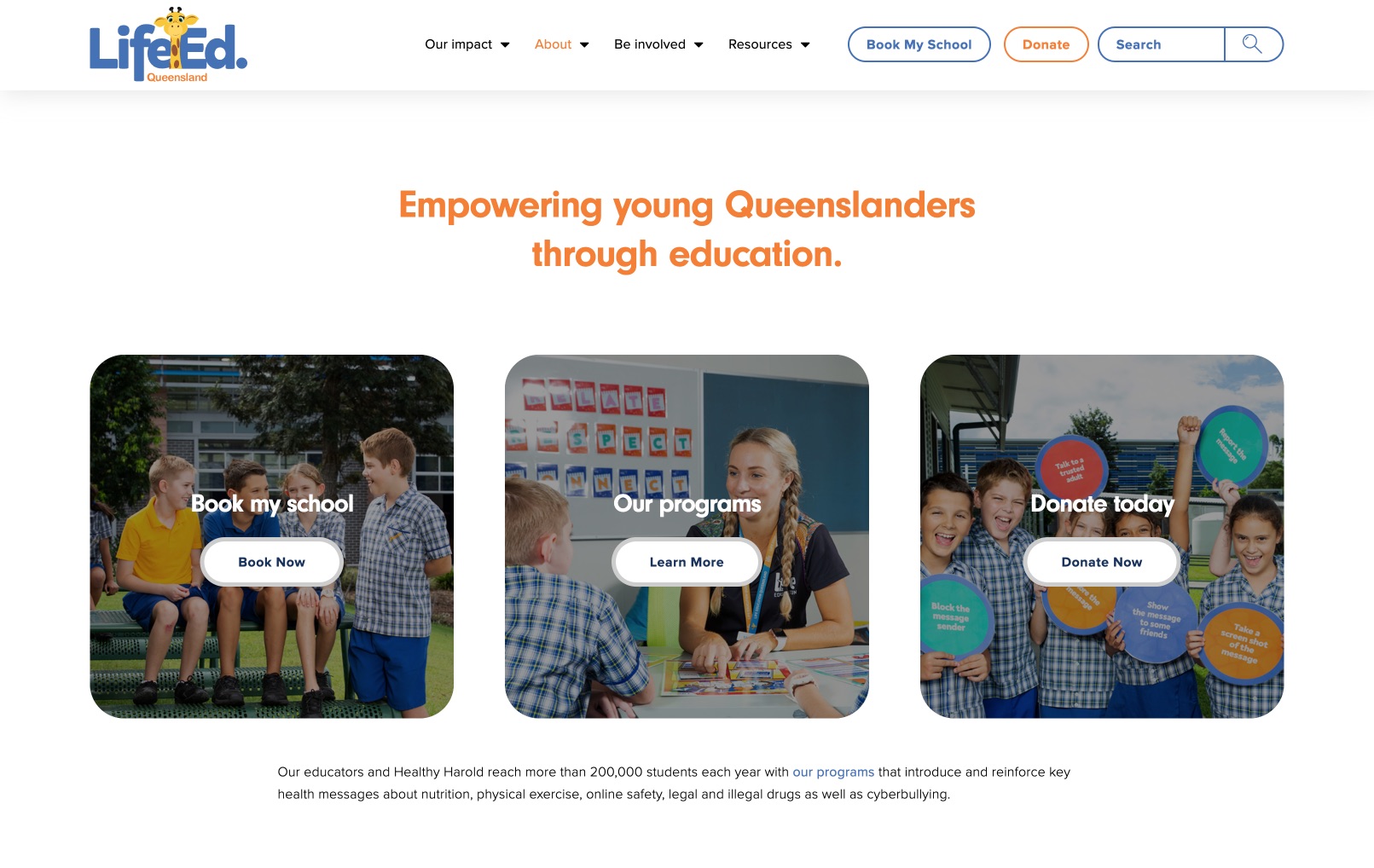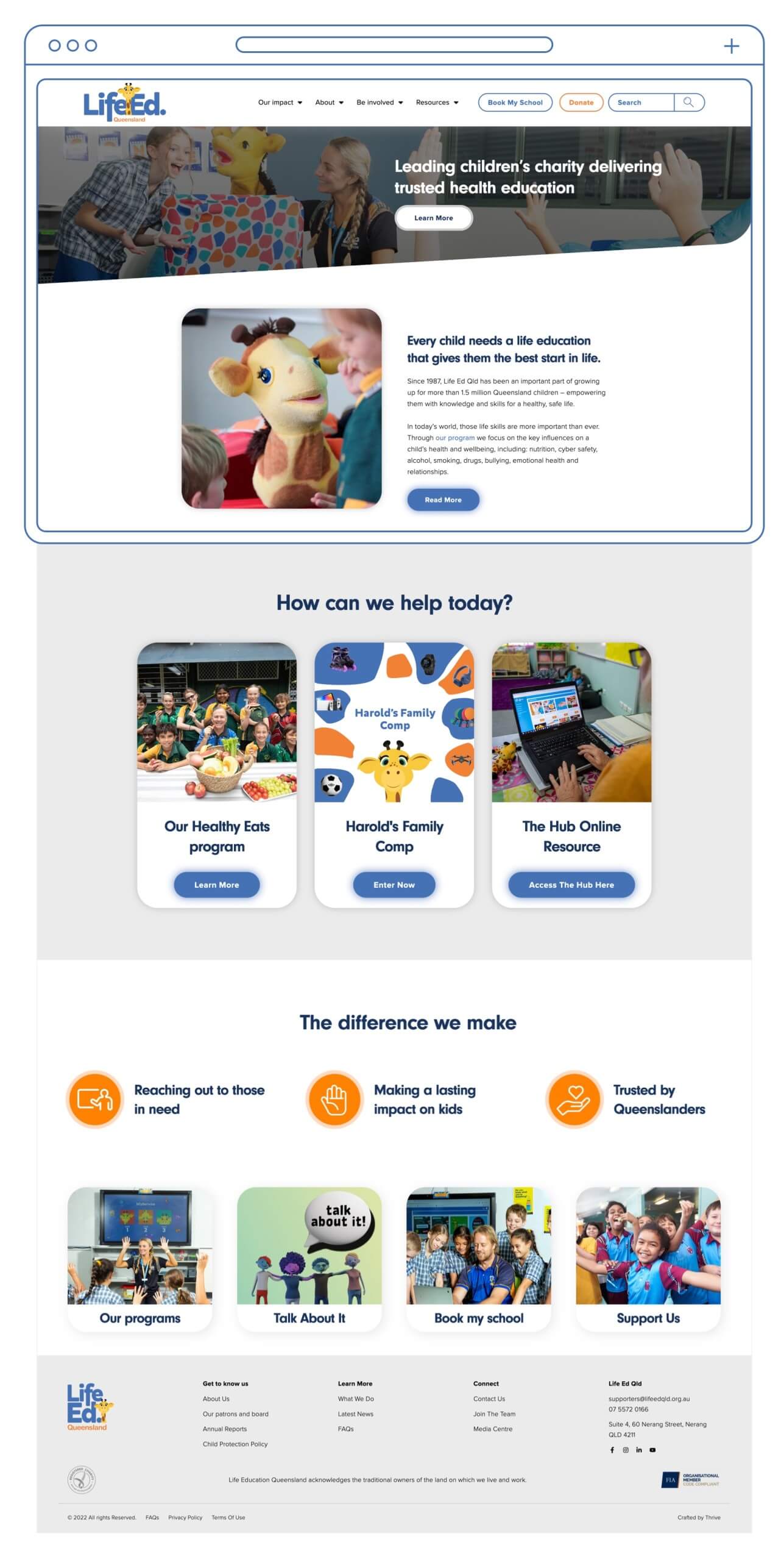 Life Education Queensland programs teach children safer and healthier choices by introducing key health messages about nutrition, physical exercise, online safety, legal and illegal drugs, and cyberbullying. To reflect the interactive nature of Life Education Queensland, we’ve created an engaging site while being clean and simple in functionality. A digital persona aligned with their playful brand yet could easily convey vast amounts of important information and help create a personalised educational experience.