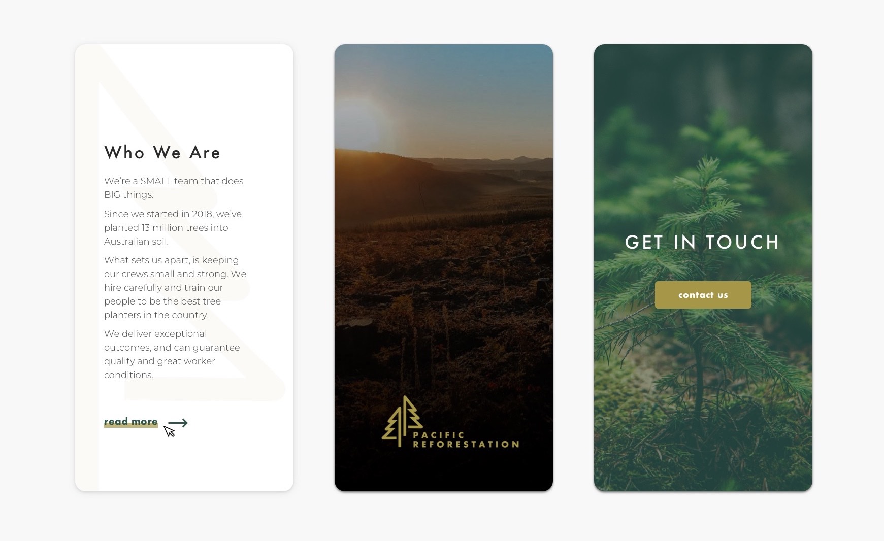 Pacific Reforestation uniquely keeps their crew small and strong, hiring carefully and training their staff to be the best tree planters in the country. With sustainability at the core of their business, planting on average 5 million trees a year, we wanted to create a distinguishable brand that encompassed it all. We created a simplistic, yet memorable logo in gold that portrayed Pacific Reforestations credible status in the forestry sector. For overall branding, we stuck with rich greens and clean whites that complimented the logo, while also tying in the business’ link to nature and sustainability.