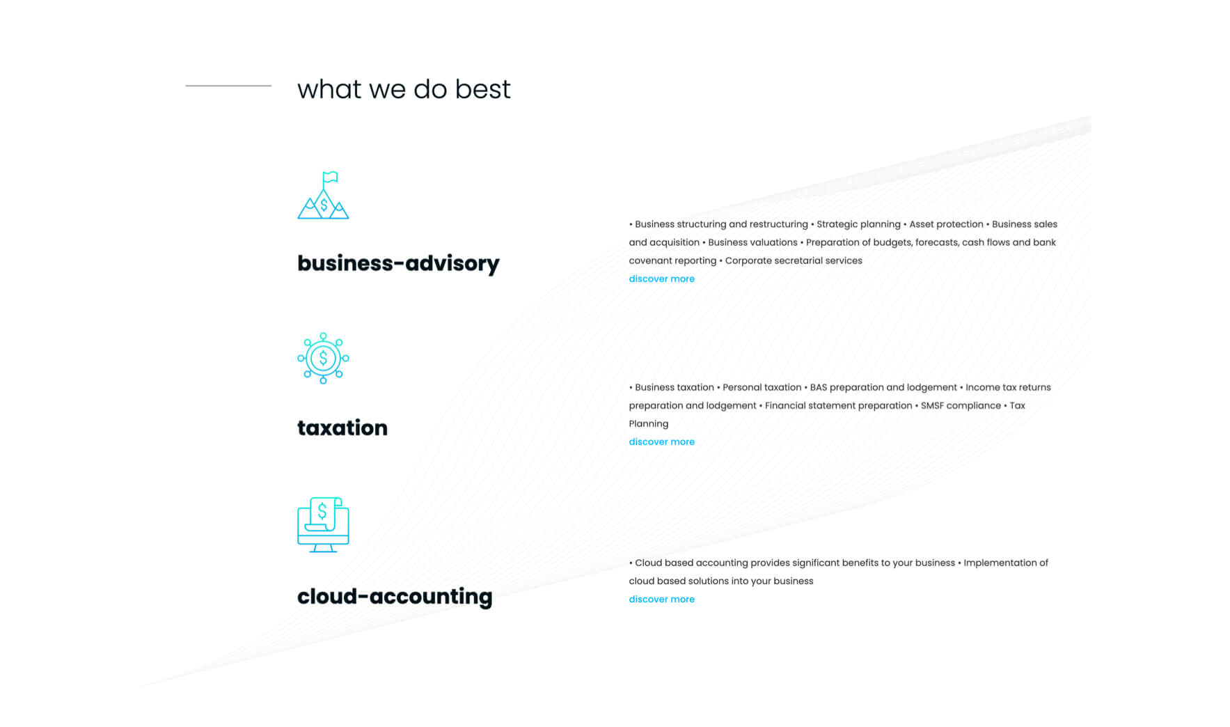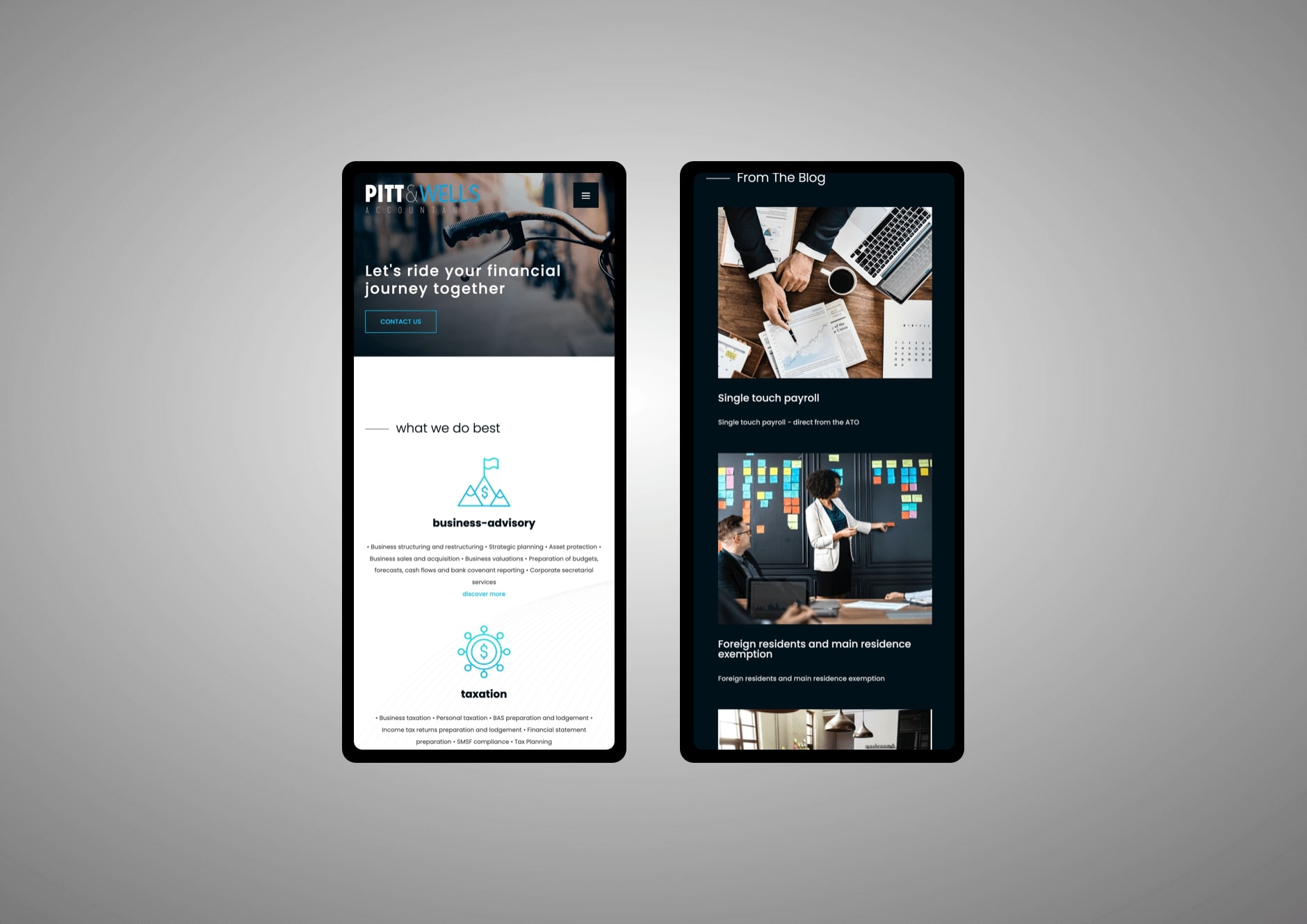 Gold Coast accountants who offer taxation, business services and personal cloud accounting. Pitt and Wells have built a reputation of quality and efficiency with their very hands-on approach and believe the importance of long-lasting relationships with clients is essential. So when the company approached Thrive, it was clear they needed an accessible, professional and friendly website. We delivered an easy-to-navigate site that was SEO friendly and modern in functionality. While being clean and simple, we still needed to add a touch of Gold Coast's balanced personality to ensure the site stood out from the competition.