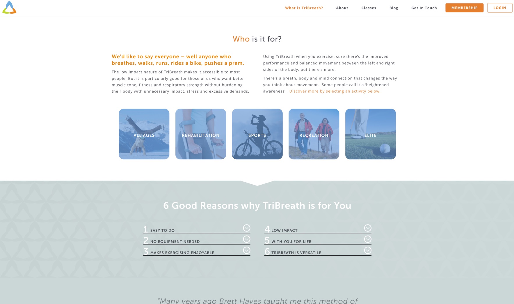 Endorsed by Pat Cash, TriBreath improves your mobility & strength by using your breath and your body in a particular way when you’re walking. Catering for a predominantly older female market, we wanted the site to be slick, clean and modern but still connect on an emotional level. Featuring a paid subscription / membership section with a huge library of videos and instructional information. The hidden section has its own unique navigation and design. Thank you so much for all the work you have put in so far, you really are a dream to work with.